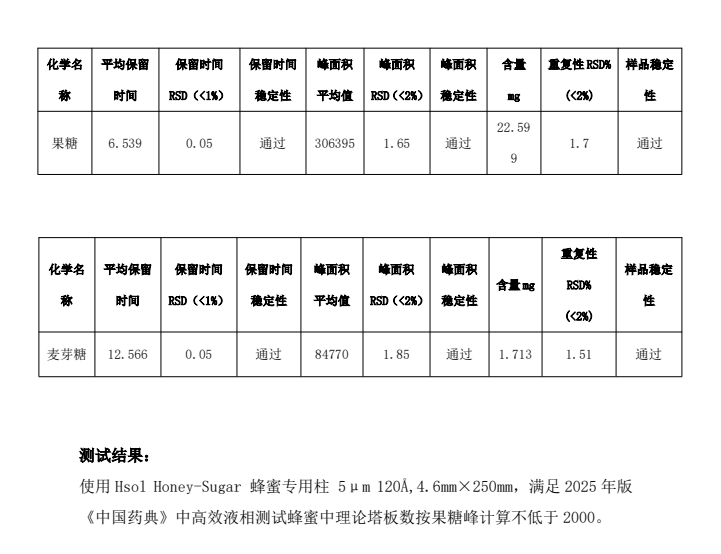 嚴格依照藥典方法開發(fā),分離度、對稱性、保留時間及柱效均滿足蜂蜜含量測定的全部參數(shù)要求。