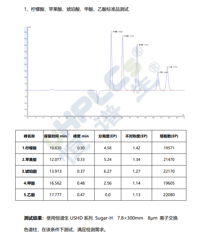 恒譜生 USHD 系列 Sugar-H 離子交換色譜柱,采用磺化聚苯乙烯-二乙烯基苯(PS-DVB)為基質(zhì)的氫型強陽離子交換樹脂,專為有機酸及酸性雜質(zhì)分析而設(shè)計。