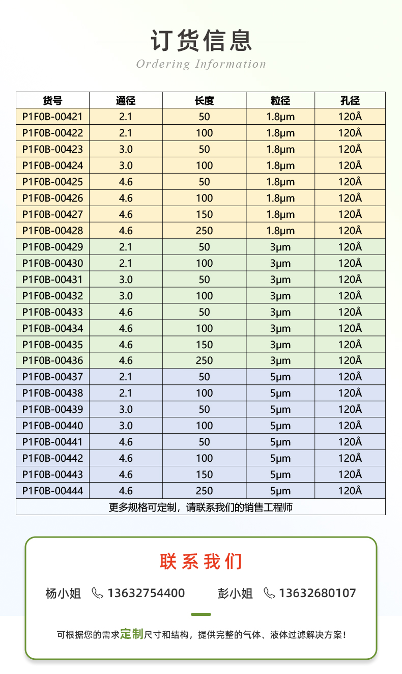 常用產(chǎn)品規(guī)格(mm) 2.1*50、2.1*100、3.0*50、3.0*100、4.6*50、4.6*100、4.6*150、4.6*250