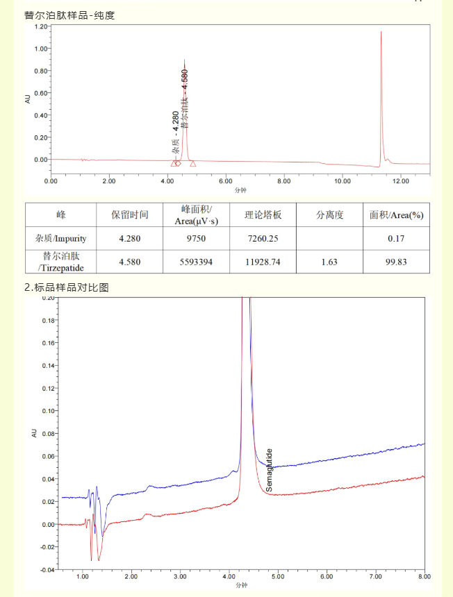 使用恒譜生USHD系列USHD C18-AR,3μm,120?,3.0mm*150mm,測定司美格魯肽及替爾泊肽的含量及純度,檢測結果滿足客戶要求。