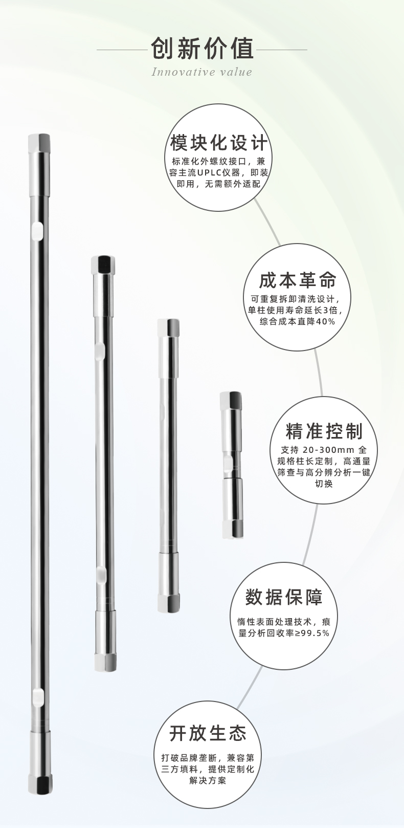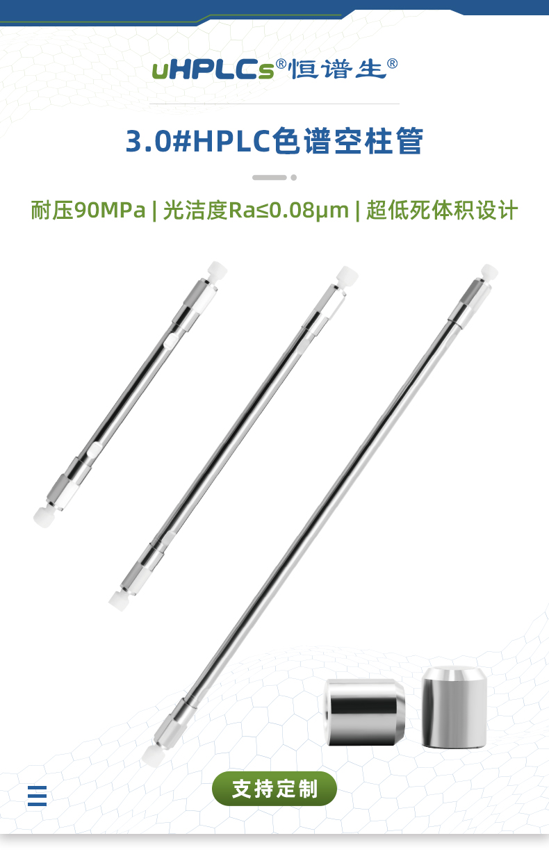 恒譜生提供種類繁多的HPLC和UHPLC色譜柱硬件,這些硬件經(jīng)過優(yōu)化,可在您的流路中實現(xiàn)選擇性、效率和高質(zhì)量的分離性能。恒譜生的色譜柱硬件系列包括可增強色譜柱功能的保護(hù)附件和連接產(chǎn)品。恒譜生液相色譜柱是通過一體化內(nèi)表打磨工藝精密加工而成,采用高質(zhì)量不銹鋼柱管,簡潔高效的外形;不銹鋼柱內(nèi)壁會經(jīng)過多次拋光,管壁內(nèi)光滑,達(dá)到0.1μ,大大提高了柱效,減小管壁效應(yīng);死體積小,保證色譜柱的高性能;規(guī)格齊全,從分析到制備的多種規(guī)格,滿足您的所需;且具有高度的一致性和重現(xiàn)性。恒譜生0.1μm高光潔度色譜柱柱管能夠快速分析的同時保持高的柱效;使用壽命長,不僅能夠減少頻繁更換色譜柱帶來的重新進(jìn)行方法驗證、條件摸索等工作,還大大的降低了使用成本;具備優(yōu)良的選擇性和分離能力,是高品質(zhì)的色譜耗材。柱管的材質(zhì)有很多,比如聚合物、玻璃、不銹鋼等。但是恒譜生建議柱管使用不銹鋼材質(zhì),因為不銹鋼這種金屬耐高壓、耐腐蝕且硬度高,相比于玻璃等材質(zhì)不易摔壞。
